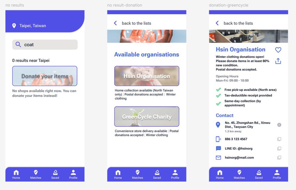 If no matching shop is found, the experience falls back to a dedicated Donation page. Based on the survey, donating was the most common current behaviour (50%), so I treated donation as a primary alternative rather than an edge case. The Donation page follows the same layout structure as the shop detail page, and provides clear, practical information (such as accepted items, condition requirements, and delivery options) to help users take action quickly.