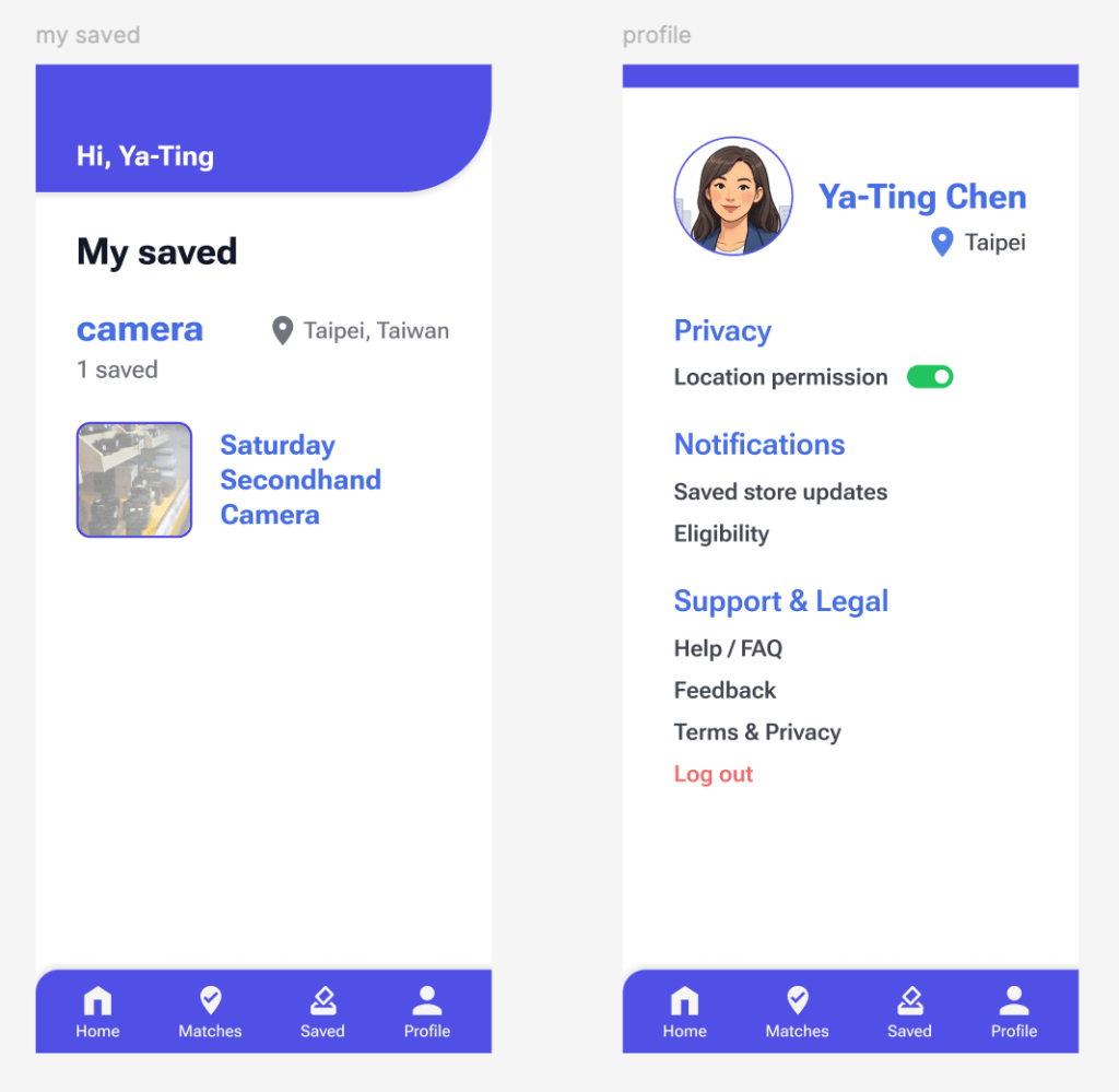 Lastly, I added a Saved page so users can bookmark shops they may want to use again, or keep for future reference. This supports repeat decisions: next time they need to sell items, they could start from these saved options instead of searching from scratch.